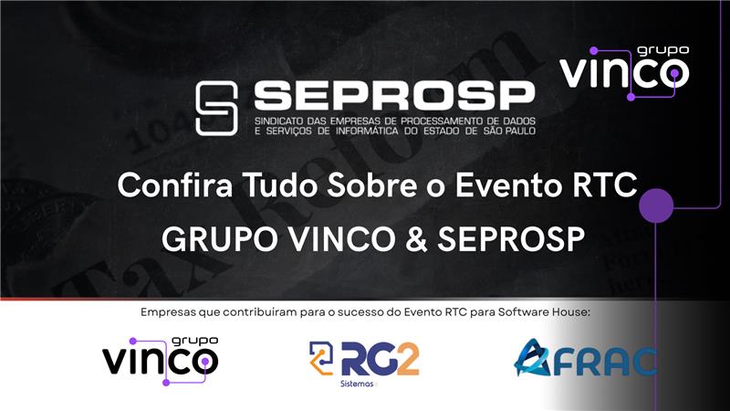 No Evento RTC, que aconteceu no dia 18 de setembro, o Grupo Vinco, RG2 e SEPROSP (Sindicato das Empresas de Processamento de Dados e Serviços de Informática do Estado de São Paulo) se uniram para debater o impacto da Reforma Tributária do Consumidor (RTC).